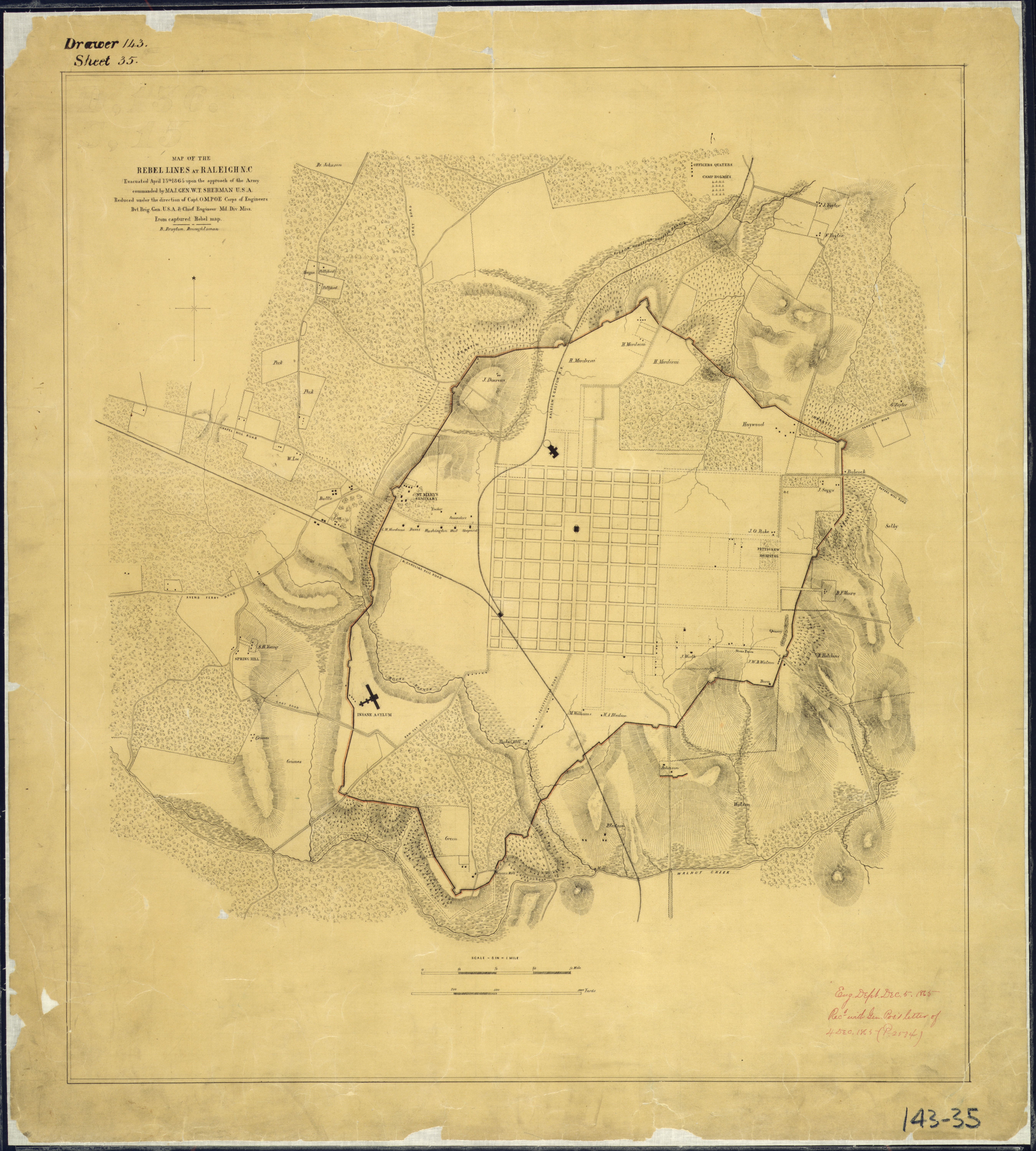 Displayed here is a map of the Confederate fortifications around the city, apparently drawn up by Union forces after the surrender of the city. Click here to see a more detailed PDF version of this map. (Might take a couple of minutes to load.)