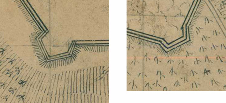 These are the artillery emplacements on the map. I had read that a redan is technically headed by a salient angle (a point, as in the structure to the left). So I wondered about the example to the right, which presents a blunt surface to the enemy. However, I later read that this flat surface is called a “pan coupé,’ and can be a feature of a redan.